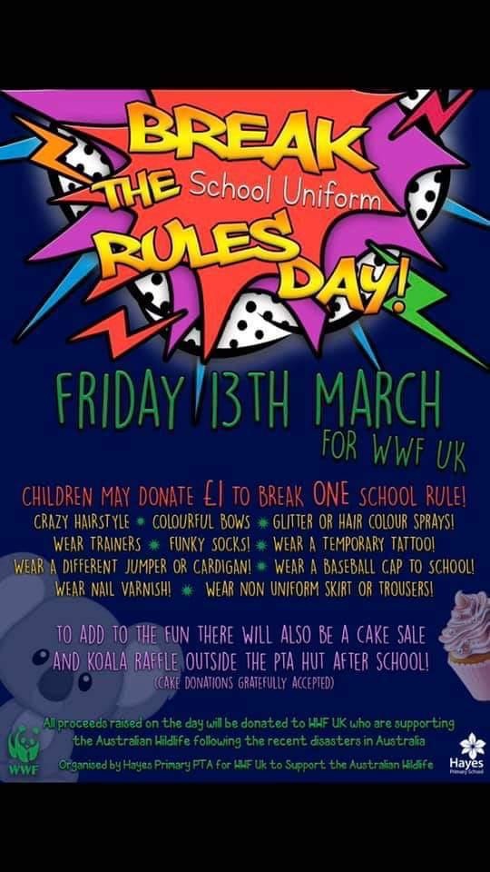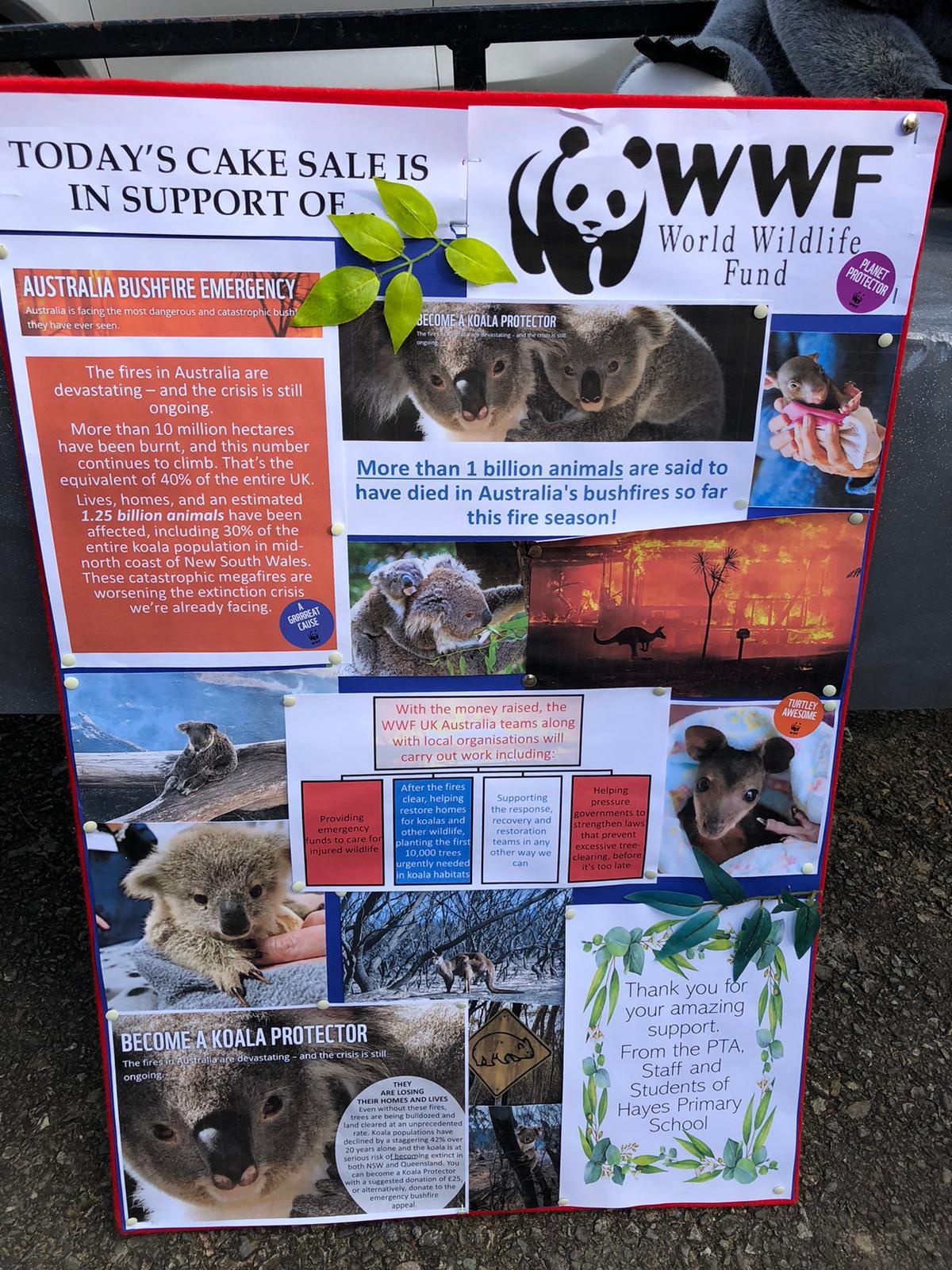 Thank you to everyone who supported this event by donated cakes, helping to set up and serve and buying cakes and raffle tickets after school! Together with the Break The School Uniform Rules Fundraiser organised by the school, we raised over £1,050 will all proceeds being donated to WWF UK who are supporting Australian Wildlife following the recent bushfires in Australia