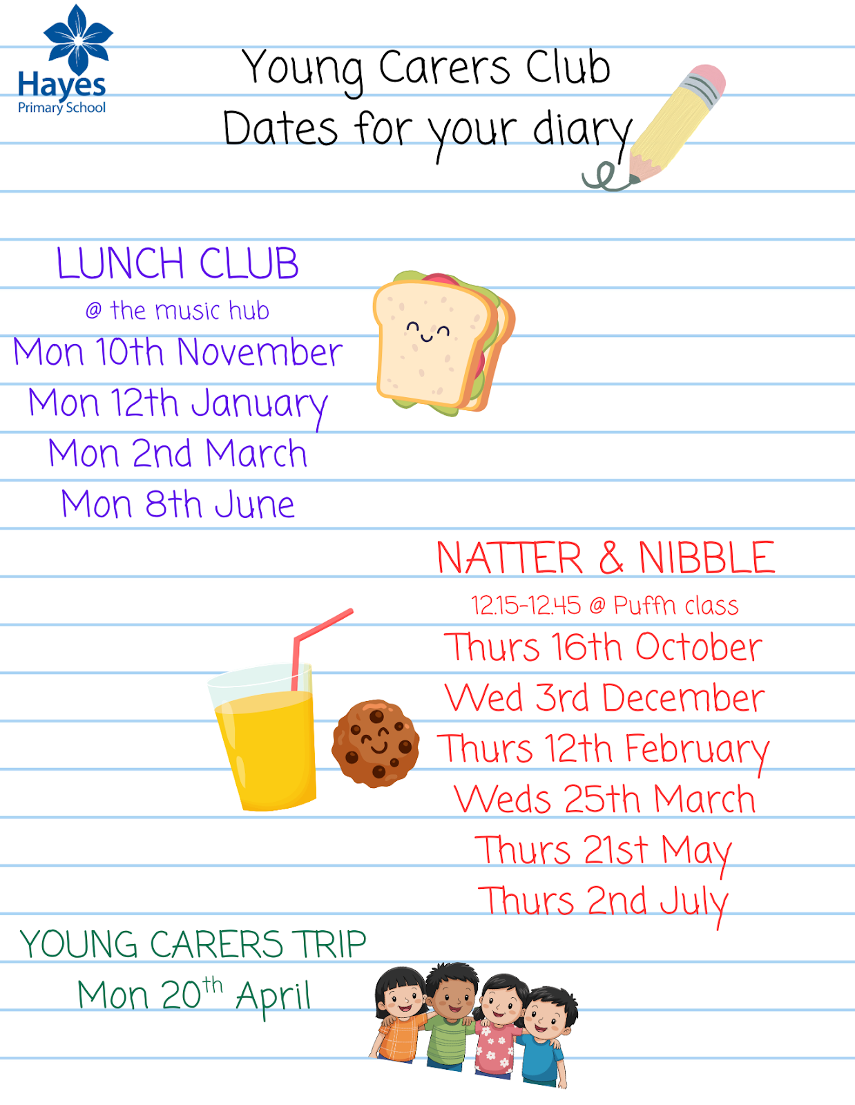 The designated young carers leads for Hayes Primary School are Mrs Moreton, Mrs Griffin, Miss Beadle, Miss Boorman and Miss Sparks.